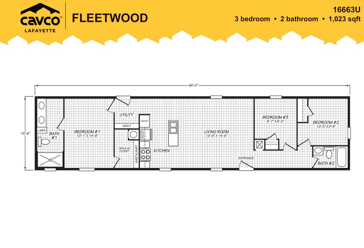 The Fleetwood Series / 16663U built by Cavco Lafayette offers 1,023 sq. ft. of beautifully arranged living space featuring 3 bedrooms and 2 bathrooms. The open-concept kitchen flows seamlessly into the spacious living area, creating a perfect setting for family gatherings. A private primary suite with a walk-in closet provides comfort, while secondary bedrooms offer flexibility. The 16663U balances functionality and modern design with ease.
