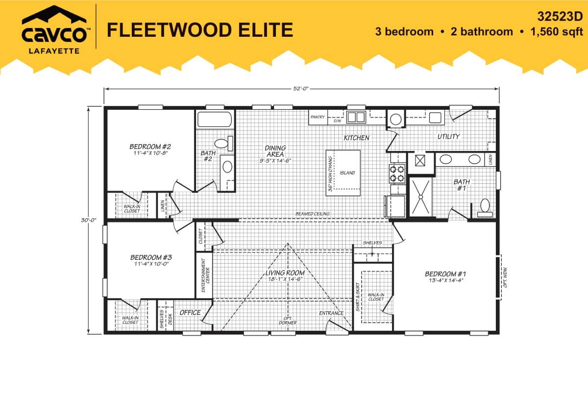 The Fleetwood Elite Series / 32523D built by Cavco Lafayette showcases 1,560 sq. ft. of thoughtfully designed living space with 3 bedrooms and 2 bathrooms. The open-concept kitchen features a center island and connects seamlessly to the dining and living areas, creating a welcoming environment for family gatherings. A dedicated office adds extra functionality, while the primary suite offers privacy and comfort. The 32523D combines spacious design with modern convenience.